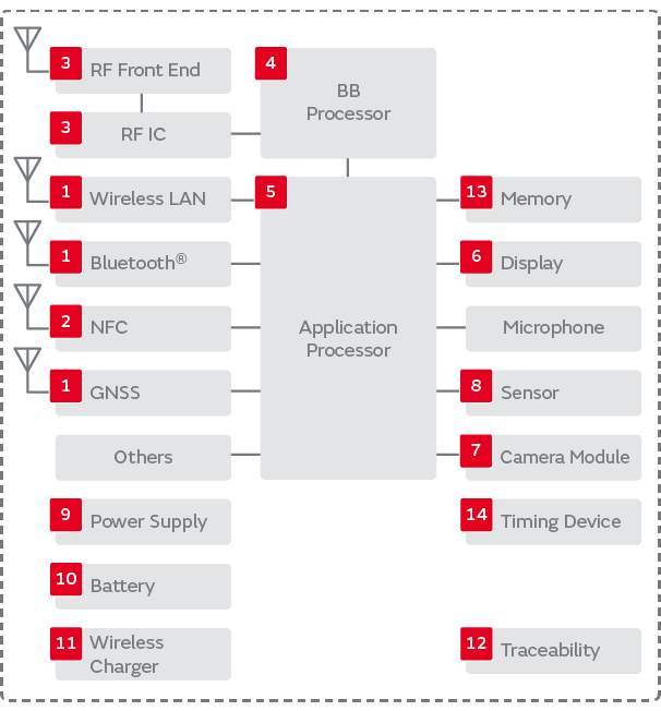 有望增长并已引起关注的可穿戴(Wearable)设备市场。村田产品通过手机和智能手机培养了技术,在可穿戴设备市场上也通过无线通信模块、传感器、电容器等为实现小型化、薄型化和低功耗做贡献。