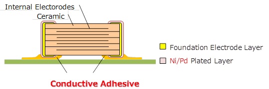 - Newly developed electrodes made of nickel (Ni) and palladium (Pd) are employed for the external electrodes of the new capacitors, producing a high bonding reliability with conductive adhesives even during use in high-temperature environments. Furthermore, the terminal electrodes of the capacitors have a superior corrosion resistance compared with our previously available products (GCG series).