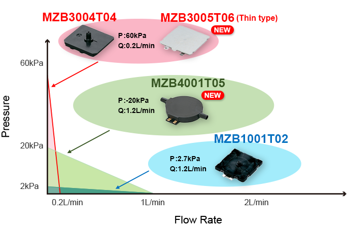 Our lineup of microblowers previously contained only products specialized for discharge/suction pressure and products specialized for flow rate. The newly developed MZB4001T05 is designed to be small and thin while maintaining the balance between pressure and flow rate.