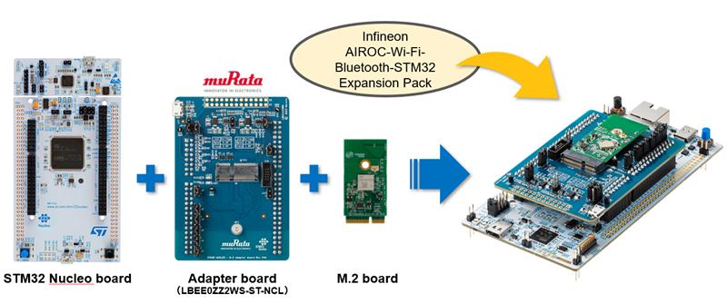 The joint project is built on the collaboration with Infineon and Murata. / By combining each company’s extensive expertise, the collaboration has engineered a complete hardware and software solution that addresses a number of IoT development requirements. At its core, the platform solution allows STM32 microcontroller to connect Murata M.2 wireless modules featuring Infineon chipsets. Providing the hardware connection is Murata’s new Nucleo-144 to M.2 adapted board, while software integration is enabled through Infineon AIROC™ STM32 Expansion Pack. Whether you are evaluating low-power implementations, such as wearables and battery-powered devices, or high-performance deployments, such as industrial equipment and smart homes, this exciting solution creates a more efficient evaluation process.