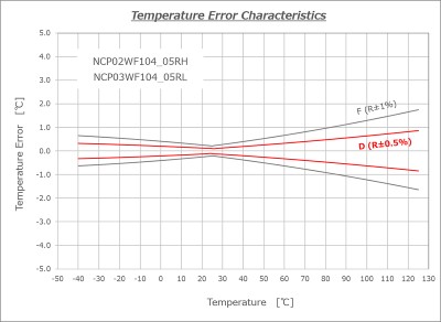 The red lines in the graph indicate the temperature sensing accuracy of Product D, which has been newly added to the lineup.