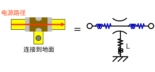 3端子电容通过其电极结构,能够将噪声旁路路径的电感的一半转换为与噪声路径串联的方向,从而实现将电容器本体或安装焊盘产生的电感减半的效果。(插入损耗可降低6dB)