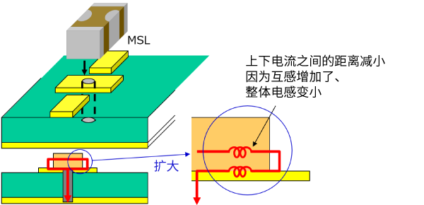 如果接地孔不在NFM的左右两侧,而是在正下方,除了左右电流的相互感应效应外,还会产生如右图所示的上下电流相互感应效应、从而使该区域的ESL进一步减小。