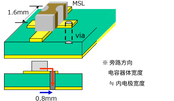 如上图所示,0603-inch(1608M)size的多层电容器与NFM相比,MSL中心到通孔的距离不到一半。