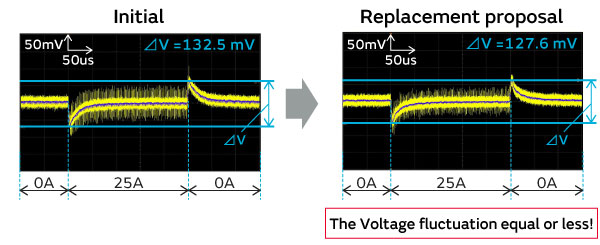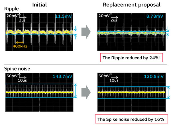 Polymer capacitors are widely used as output capacitors (decoupling capacitors) in the output section of DC-DC converters for smoothing purposes. By replacing these polymer capacitors with large-capacity MLCCs, there are advantages such as downsizing equipment, increasing reliability, and achieving high noise reduction effects. This content provides an example of the benefits of replacing polymer capacitors with high-capacity MLCCs for the output capacitors used in DC-DC converter test boards.