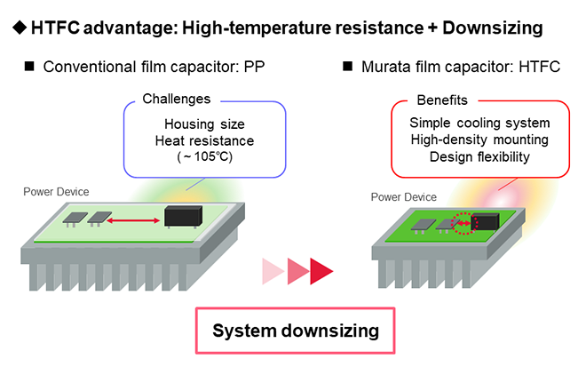 Currently, PP film capacitors commonly used for automotive/industrial applications are generally guaranteed up to 105°C. The capacitors we now introduce here are high-heat-resistant film capacitors (FH series) that can be used continuously at 125°C. We have commercialized these capacitors with Shizuki Electric Co., Inc. using a high-heat-resistant film material developed by Murata Manufacturing.