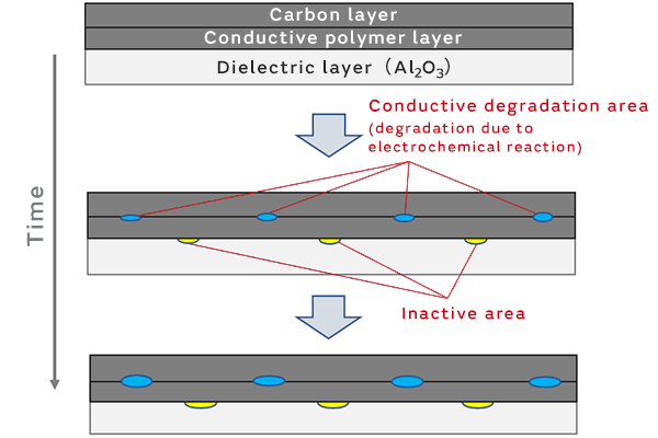 Specifically, deterioration appears as a decrease in capacitance and an increase in ESR due to the electrochemical reaction of aluminum oxide (dielectric), which is an internal component, and organic components such as conductive polymers and carbon paste.