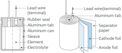 Aluminum electrolytic capacitors are also classified by whether the electrolyte is a liquid or solid. Aluminum electrolytic capacitors with a liquid electrolyte are only the can type, which can hermetically seal in the liquid electrolyte (electrolytic solution). They are characterized by a large capacity and high withstand voltage.