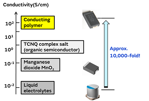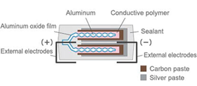 Meanwhile, aluminum electrolytic capacitors with a solid electrolyte do not need to be hermetically sealed because they are a solid (conductive polymer). Therefore, there is a resin-molded surface-mounted type in addition to a can type. They are characterized by a large capacity and low product height. Furthermore, there is no risk of volatilization because it is a solid electrolyte. This means they are characterized by a long service life compared to capacitors with liquid electrolytes.
