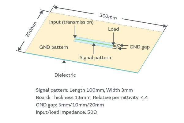 A 100mm signal pattern is surrounded by a GND pattern. There are constant spacing (GND gap) between the signal pattern and the GND pattern on either side (Coplanar waveguide transmission line). We prepared different models with GND gaps of 5mm, 10mm, and 20mm. The other conditions were the same, with a signal pattern width of 3mm and an input/load port impedance of 50Ω. The input signal was at 1V (Peak), and scanned frequency range was 30MHz to 1GHz.