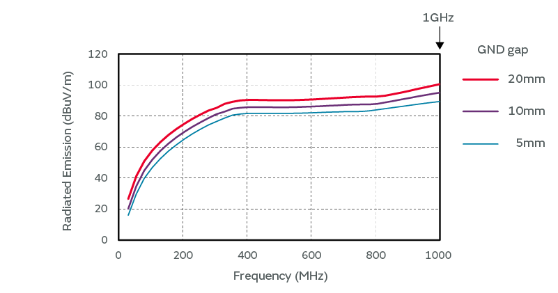 Figure 2-3 shows the simulation results of the radiated emission. As you can see, the radiated emission becomes stronger as the size of the GND gaps is increased.