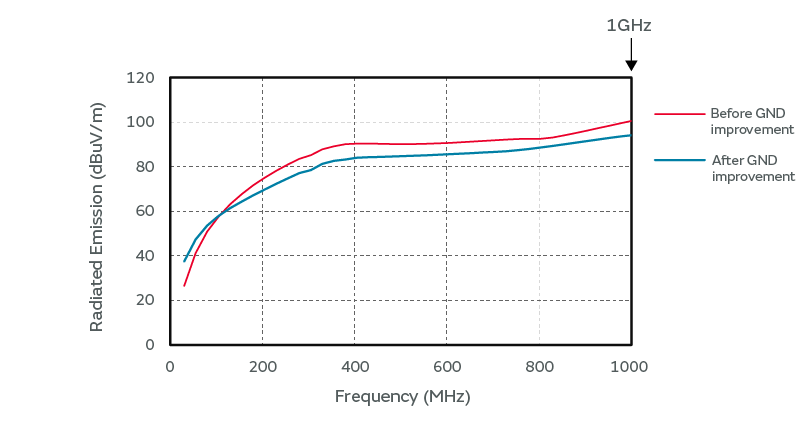 Figure 2-7 shows the change to the radiated emission due to the GND improvement. As you can see, the radiated emission is improved by connecting the board GND to the GND plate.