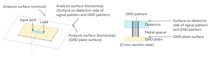 Next, we simulated the magnetic field distribution. Figure 2-4 shows the analysis surfaces. The analysis surface (horizontal) was set at the dielectric side (bottom) of the signal pattern and GND pattern. This is because the magnetic field was stronger at the bottom than at the surface layer side (top) near the signal pattern. The analysis surface (vertical) was set at the center of the board. We set the analysis frequency to 1GHz, which had the strongest radiated emission.