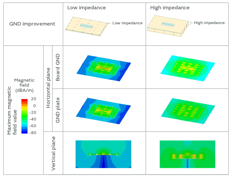 We can see that as the GND width is narrowed down, the magnetic field wraps more strongly around to the back surface of the board, resulting in a significant change in the magnetic field distribution. This indicates that it is advantageous to consolidate the circuits that have strong noise due to a high-speed signal at the center of a large board.