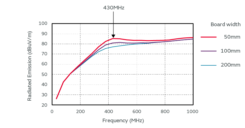 Figure 2-14 shows the results of the radiated emission simulation. When the board width is narrowed down, the noise increases to around 430MHz.