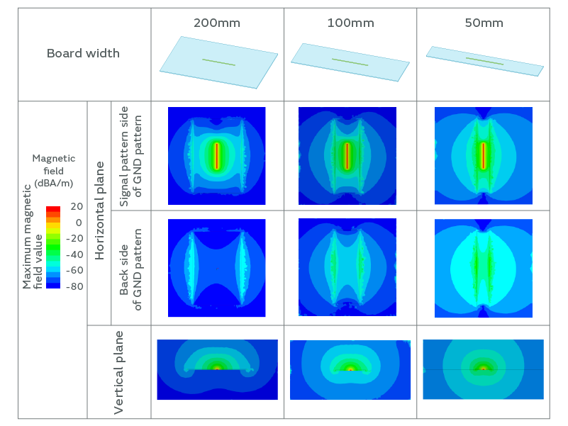 - When the board width is 100mm, the magnetic field starts to wrap around to the back surface of the board (GND surface).
