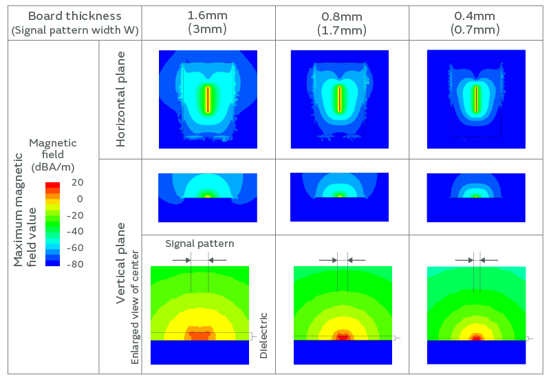 As described earlier, the noise reduction effect can be achieved by making the board thinner and decreasing the distance between the signal pattern and GND pattern. However, because thinner boards tend to bend more easily and increase the risk of failure, it is necessary to use multilayer boards to ensure the appropriate thickness.