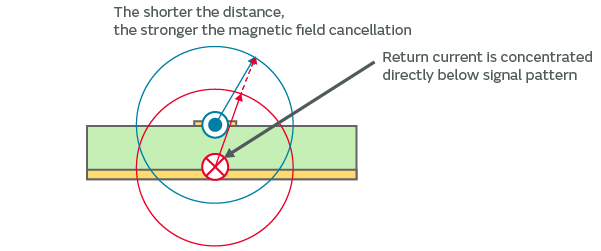 - Due to the shorter distance between the signal pattern and GND pattern, the return current is less likely to spread and is concentrated directly below the signal pattern.