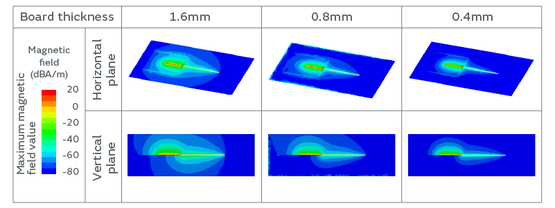 As you can see, the radiated emission decreased. The magnetic field distribution also shows a decrease in the noise generated by the board, as well as the noise propagated to the shielded cable. In other words, reducing the thickness of the board is also effective at suppressing the noise that propagates to and radiates from the cable shield.