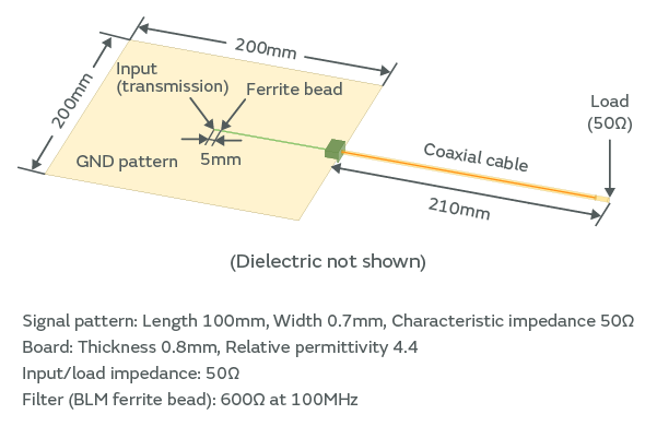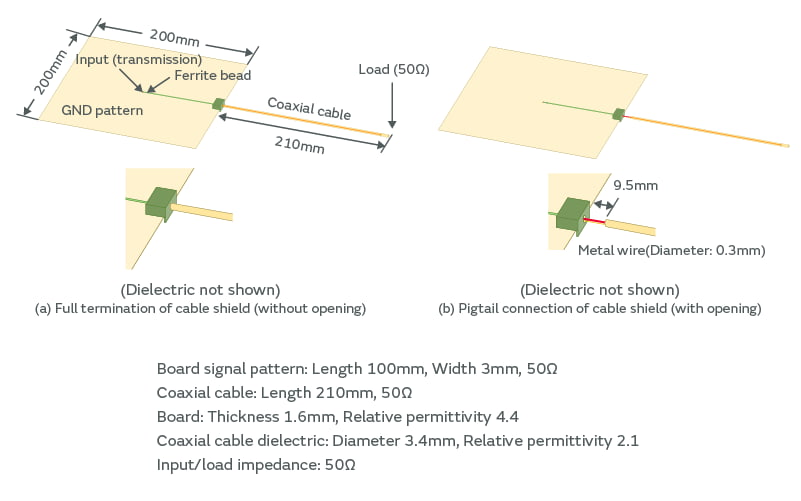 The simulation model is shown in Figure 3-1. We cut the board to align its edge with the end of the signal pattern, and connected a shielded cable. We set the characteristic impedance of the shielded cable to 50Ω, and used a 50Ω termination in the cable. We prepared four different models. One model did not have a cable, and the other three had cable lengths of 110mm, 210mm, and 410mm.
