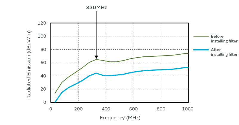 By filtering the signal line in this way, we can suppress the noise from the board, as well as the noise radiation from the cable shield.