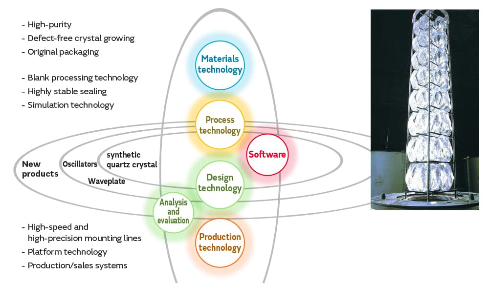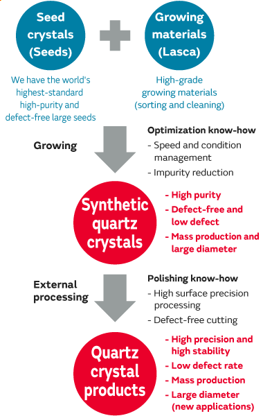 In other words, the in-house production of high-quality synthetic quartz crystals is essential for high-grade and high-precision quartz crystal products.