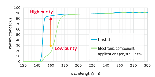When the wavelength enters the deep ultraviolet range (200 nm or less), absorption of impurities becomes a problem. These numbers are a comparison of the metal impurity concentration in a regular synthetic quartz crystal and our Pristal. The absorption of aluminum in particular produces a big difference in the transmission performance.
