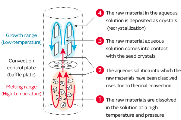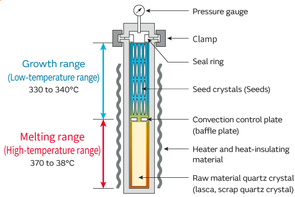 Synthetic quartz crystals are grown in a high-temperature and high-pressure atmosphere using the fact that the solubility of quartz crystals in an alkaline solution differs depending on the temperature (more quartz crystals dissolve at higher temperatures). They are grown using the so-called hydrothermal synthesis method.