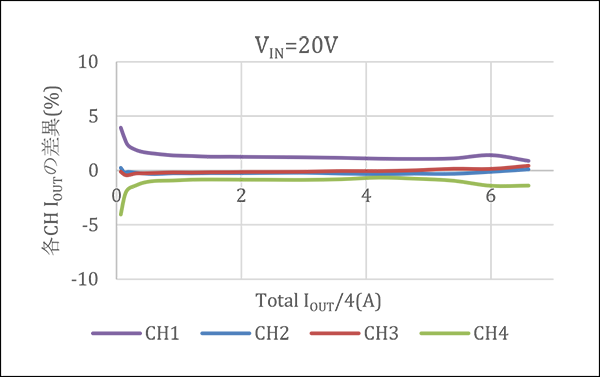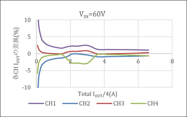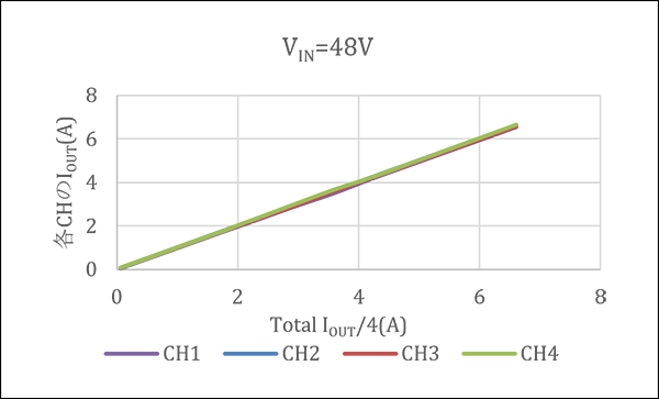 Figure 7 shows the current sharing for each input voltage, and Figure 8 shows the current difference from the equally current-shared state (IOUT/4) for each input voltage. The results show that good current sharing of ±3% or less is achieved in the range of load current IOUT=1 A or higher. At light loads, current values are low and temperature compensation is difficult to apply, so there tends to be a difference in current values between modules, but the measurement environment is one factor in this variation of effects. Future work is needed on measurement methods to improve measurement accuracy at light loads, such as the offset of operational amplifiers for current amplification and the accuracy of measuring instruments.