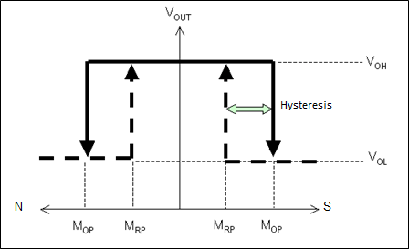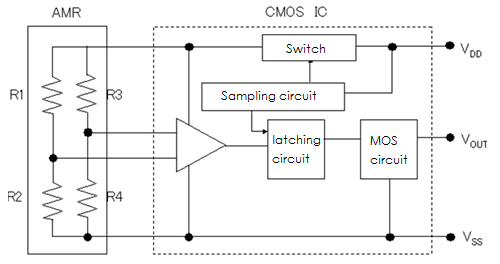 In a magnetoresistive element, the resistance changes when a magnetic field is applied perpendicular to the electrical current direction. AMR sensors have a wide range of placement patterns as shown in the figure, and they consist of a combination of elements that change the resistance (R1, R4) and elements that do not change the resistance (R2, R3).