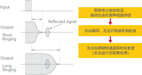 即使停止输入信号,在传感器的振动停止之前也无法得到接收的波。 这里的振动时间叫做余响时间,余响时间太长则无法进行近距离检测。