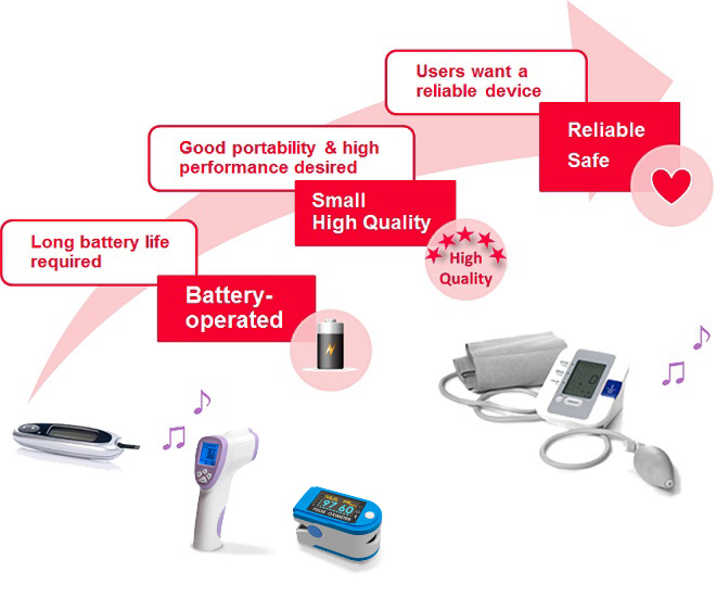 Crystal units is used in the microcomputers and wireless communication ICs in various COVID-19 countermeasure products such as non-contact thermometers, pulse oximeters, trackers, test kits and analyzers, ventilators, and dispenser for alcohol and hand soap, in healthcare products such as insulin pens, inhalers, blood glucose meters, blood pressure monitors, bathroom scales, and activity meters. Piezoelectric sounders are used for confirmation sounds in these products.