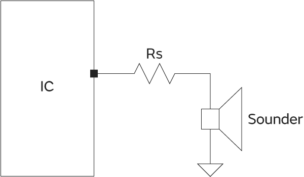 Sound is produced by driving the piezoelectric sounder in accordance with the signals input from the IC. Accordingly, the frequency at which sound is produced and the SPL change with the frequency and voltage of the signals input from the IC. Fig. 1 shows an example of a circuit in which the sounder is driven directly by an IC.