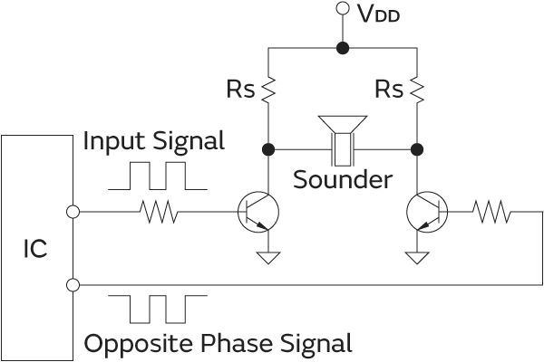 A typical drive circuit of a piezoelectric sounder is a circuit driven directly by an IC.