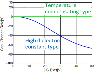 As ceramic capacitors for temperature compensation have no DC bias characteristic, there is no change in capacitance.