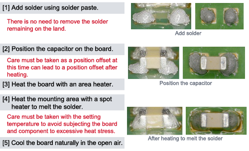 The procedure for repair or reworking of a 0603-size capacitor on a high-density mounted board is described below.