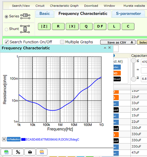 SimSurfing design support software is available on our website. This software allows you to download characteristic chart displays and characteristic data for the ECAS series. You can also check the impedance frequency characteristics and other characteristic data in addition to the ESR and ESL values.