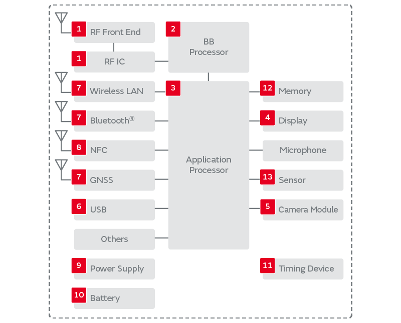 对内置高速5G通信功能的智能手机(Smartphone)的需求正在迅速增长。村田凭借在智能手机上占有较高市场份额的产品阵容为终端的发展做贡献。我们提供RF部件、模块产品、多频段支持产品、提高功能和易操作性的传感器、低损耗电容器和功率电感器等。