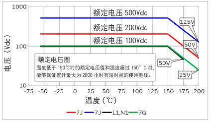 产品温度超过150℃时,请按照下面的额定电压降低施加在电容器上的电压再使用。