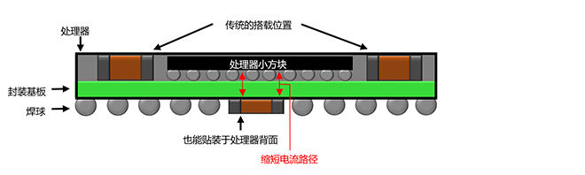 本产品非常薄,能够直接贴装于处理器封装背面的焊球之间,故而也能为处理器封装小型化做贡献。此外通过将电容器贴装于处理器封装的背面,使电容器与处理器Die(小方块)的距离比传统的侧面配置更近,能够进一步低阻抗化