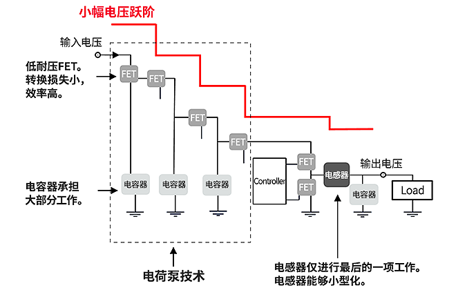 本产品采用融合特有的“电荷泵技术”(5)与传统的DC-DC转换器电路的新方式“2阶结构”。通过以小幅电压阶跃降低输入电压,从而能使用低耐压FET(6),减轻对各个电感器的依赖度,从而实现了小型且高电压转换效率的DC-DC转换器。而且由于经降压的电压为DC-DC转换器电路的实际输入电压,故也解决了因输入电压与输出电压之差所造成的占空比问题。