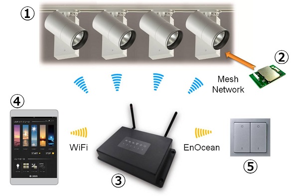 我公司为了满足这种需求,通过在每一台灯具嵌入具有通信功能的无线模块,实现了能够以无线控制方式进行单独调色、调光,同时也开发了能管理所有照明器具的无线照明控制系统。从而能够以简单的操作进行单独照明器具的调色和调光,达到准确的照明效果。并且由于不需要铺设照明控制的配线,从而提高了照明设计的自由度。