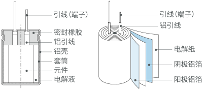 铝电解电容器还被根据电解质是“液体”还是“固体”来分类。电解液为“液体”的铝电解电容器只有能将液体电解液(电解液)气密密封起来的罐型,具有容量大、耐压高的特点。