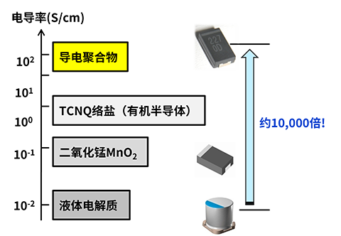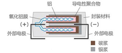 另一方面,采用“固体”电解质的铝电解电容器因为是固体(导电聚合物)而不需要气密密封,所以不仅有罐型,而且有树脂成型表面贴装型,具有容量大、产品高度低的特点。此外,由于是固体电解质,所以不存在挥发的风险,因此具有比液体电解质寿命更长的特点。