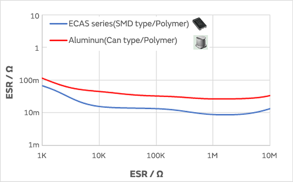 铝电解电容器(绕组型)相比,ECAS系列的ESR更低,因此有助于降低纹波噪声和针对负载波动的电压波动稳定性。