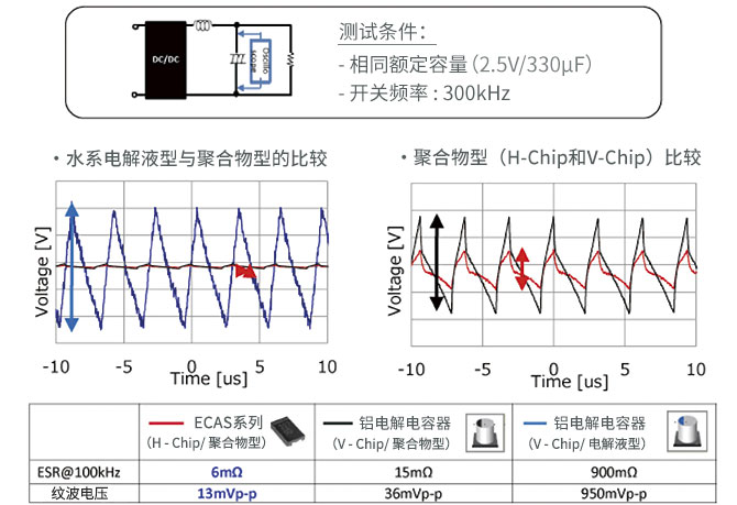 在抑制电压波动的用途中也常常使用聚合物型的钽电解电容器、聚合物型的铝电解电容器(罐型),但ECAS系列比它们的ESR更低,ESR和静电容量之间的平衡好,因此非常适合用于抑制电压波动的用途。这种ECAS系列已被广泛用于个人电脑(笔记本电脑、服务器、主板、复合机等)、数字AV设备(液晶电视、游戏机等)。