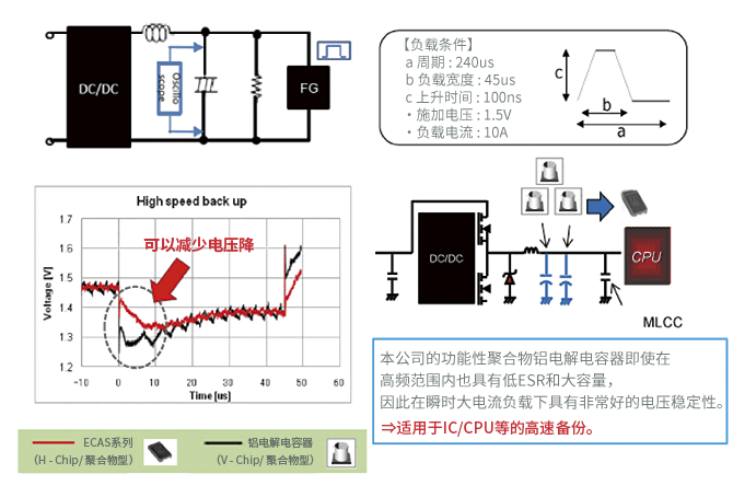 ECAS系列具有低ESR、低阻抗、静电容量稳定的特征,因此非常适合用于负载电流波动较大的CPU等多种电源线的平滑(纹波吸收和瞬态响应)用途中。ECAS系列基本上都跟MLCC组合起来使用,在抑制电压波动(高速备份)用途中特别能够发挥作用。