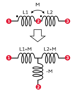 去寄生电感降噪元件(LCT)在元件内部内置两个线圈。通过使这两个线圈靠得很近,成为相结合的变压器构造,从而在两个线圈的中间部分产生负互感(−M)。利用村田制作所的陶瓷多层技术,这负互感实现了高精度的稳定的M值。