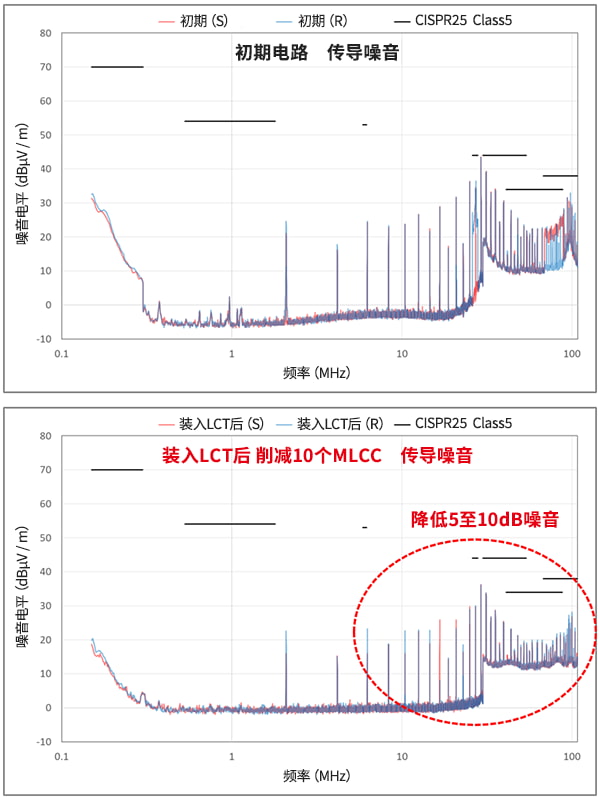 从图可知增加LCT后,即使削减10个MLCC也能降噪。尤其是在包括FM无线电频带的20至108MHz的频率,效果很大。
