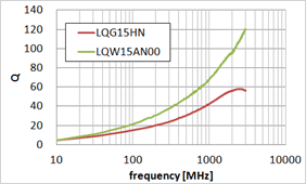 图1: 叠层型LQG15系列与绕线型LQW15系列的Q值特性比较 (均为2.7nH)